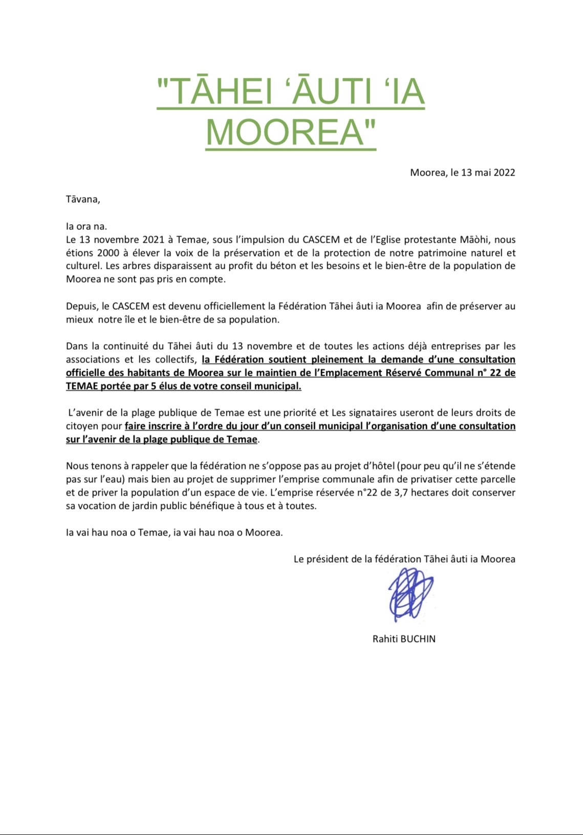 La fédération se félicite de la demande récente du président du Pays d’organiser une consultation pupulaire pour le devenir de Temae . Pour rappel, Au mois de mai 2022 déjà , sous l’impulsion de 5 élus de la commune de Moorea-Maiao appuyée par la fédération Tāhei et relayée par l’église protestante māòhi, une pétition citoyenne a été lancée afin de demander aux membres du conseil municipal de Moorea-Maiao d’inscrire à l’ordre du jour d’un prochain conseil municipal un projet de délibération visant à organiser une consultation locale des électeurs sur le devenir de l’emprise réservée n° 22 inscrite au PGA de Moorea depuis 2013, pour un projet de jardin public en faveur des habitants de Moorea-Maiao, dans la cocoteraie de l’actuelle plage publique de Temae.  Au terme d’un mois de consultation, nous avions recueilli 3733 signatures d’administrés dont 2805 électeurs, qui sont favorables à ce que cette question soit ramenée devant la population afin qu’elle puisse, elle aussi, donner son avis.